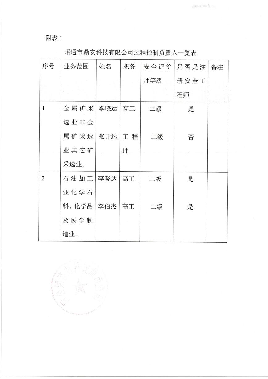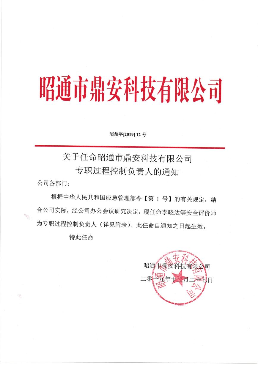 關于昭通市鼎安科技有限公司專職過程控制負責人的通知