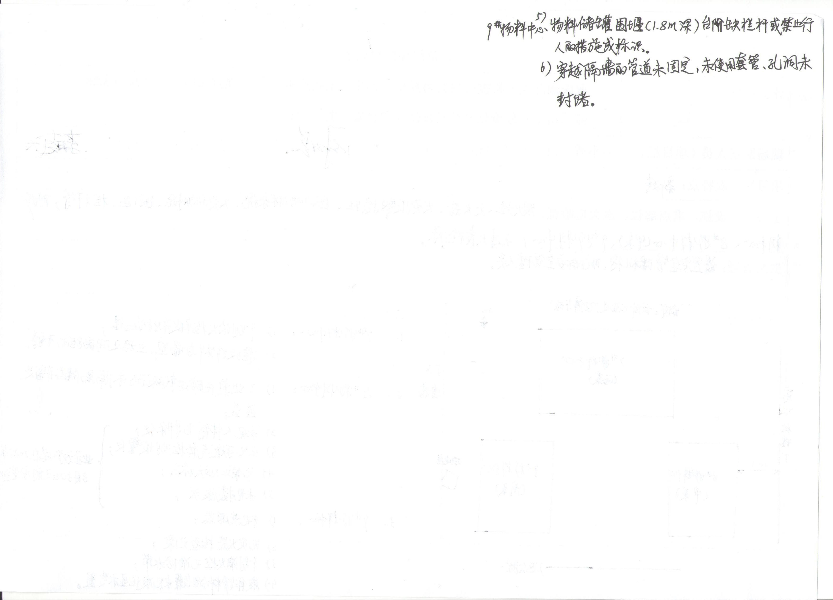 隱患: (1)7#物料中心(丙類)個別消火栓被雜物遮擋。 (2)7#物料中心(丙類)堆放物料與墻壁、立柱之間的距離不夠。 (3)無禁止煙火標(biāo)識。 (4)無滅火器檢查記錄。 (5)個別消火栓無水帶。 (6)9#物料中心(戊類)液體物料儲罐無液位顯示裝置。 (7)9#物料中心(戊類)進(jìn)入圍堰的臺階邊緣無欄桿,圍堰缺乏禁止通行措施或警示標(biāo)識。 (8)9#物料中心(戊類)穿越隔墻的管道未固定,未使用套管,孔洞未封堵。 | ||||||||